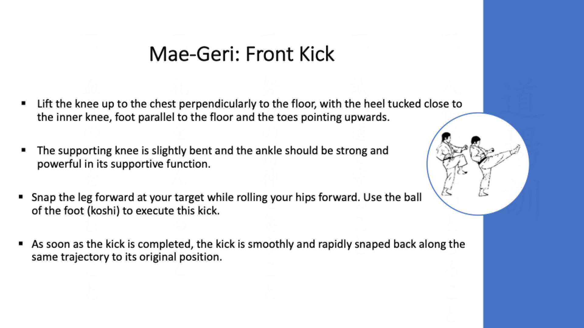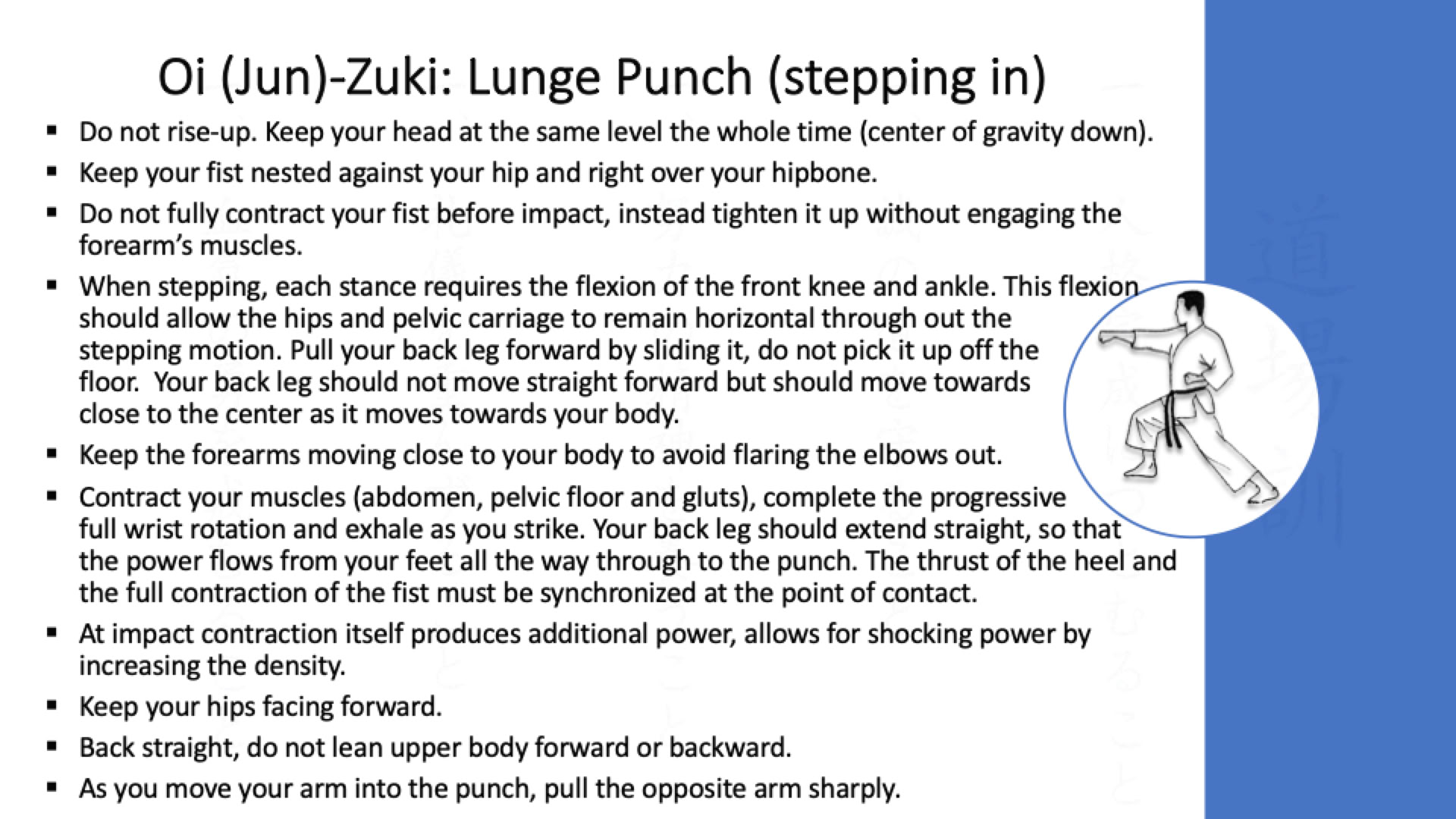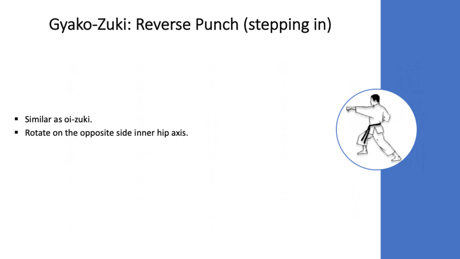 The technique involves bringing the rear leg forward (kick feint) and then snapping the leg back while throwing a reverse punch, resulting in greater power behind the punch that can effectively surprise opponents with its quickness and unpredictability. If you miss the target, it might expose you to potential counterattacks by compromising your balance and defense stance. For this reason, the karate version is closer to the ground, performed with a shorter but longer jump and a relatively more contained centerline posture (based on the application) than other full contact fighting styles.